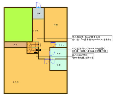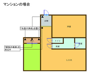マンションなどで鉢植えや八卦平面鏡が使えない場合は欠けの部分にそれぞれ水晶の六角柱を置きます。